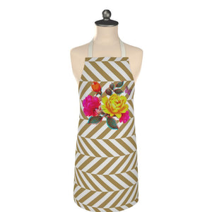 The designer Rana Salam’s signature Damascene roses and butterflies graphic make this kitchen apron a standout. With her signature gold and white stripes zig-zagged in the background, this is a bold pop art graphic that will add style to any kitchen decor. Our aprons are fine cotton, made in England. They feature pop art graphics and images found around the Middle East. They are a perfect addition to your kitchen decor.